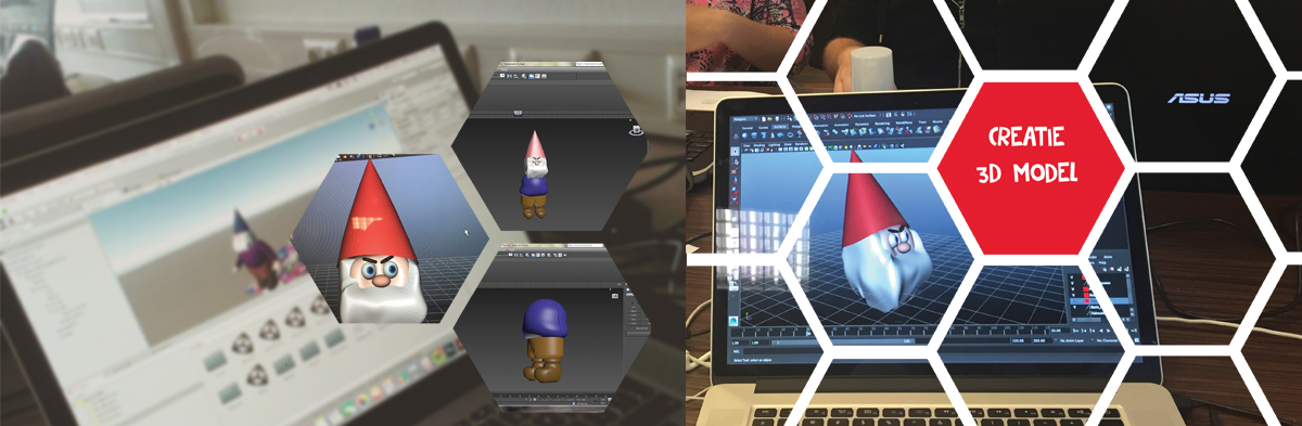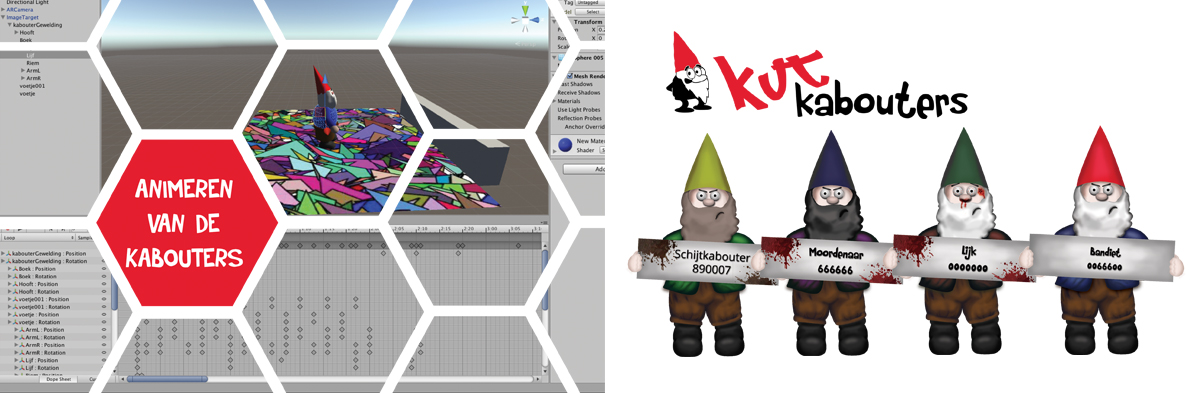 Van een grap kwam het concept 'de kutkabouters'. Het idee was om een 3D-kabouter te ontwerpen en deze via een bepaald patroon (zichtbaar op een locatie) zichtbaar te laten worden met een app. Wat nou als er een heleboel kabouters te vinden zijn door de school die allerlei rotstreken uithalen. Door middel van hints in de app kun je de locaties vinden. Wanneer je alle kutkabouters vindt, kun je met ze op de foto. Er is een moordenaar, die het slachtoffer staat uit te lachen, de dode kabouter vertoont zijn laatste stuiptrekkingen. Daarnaast hebben we nog de bandiet die een laptop probeert te stelen en als laatste een kabouter die tegen het raam poept.De opdracht was erg vrij en we zijn dus helemaal uitgegaan wat we zelf grappig vonden en hebben onze eigen grap uitgewerkt. Deze opdracht is samen uitgevoerd met Rob van Diessen en Mathijs van der Palen.